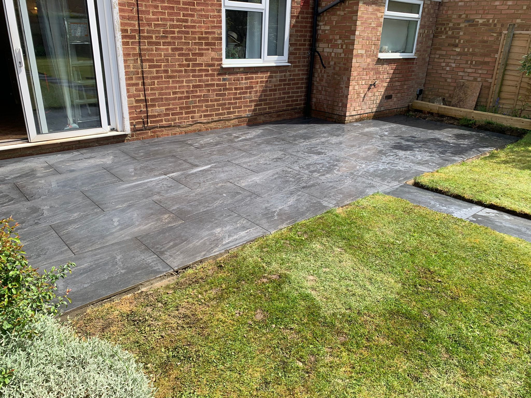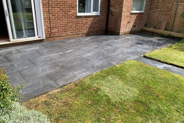 We installed an impressive Anthracite Porcelain Patio in St Albans for a customer that had used us at another property a few years earlier. Being on raised ground and with turf raising to the patio meant that we also laid some lovely steps with the same finish. We also extrended the patio out on each side to replace the grass mounds and added some wooden flower boxes for that extra touch. Another very happy client of MT Paving & Landscaping.