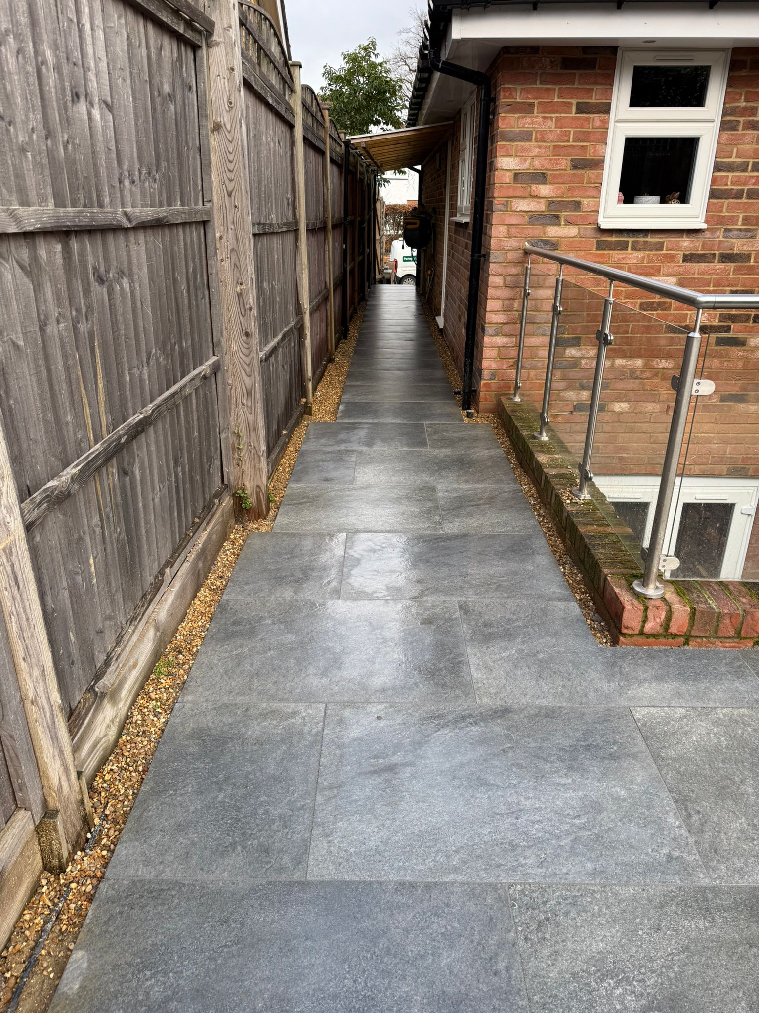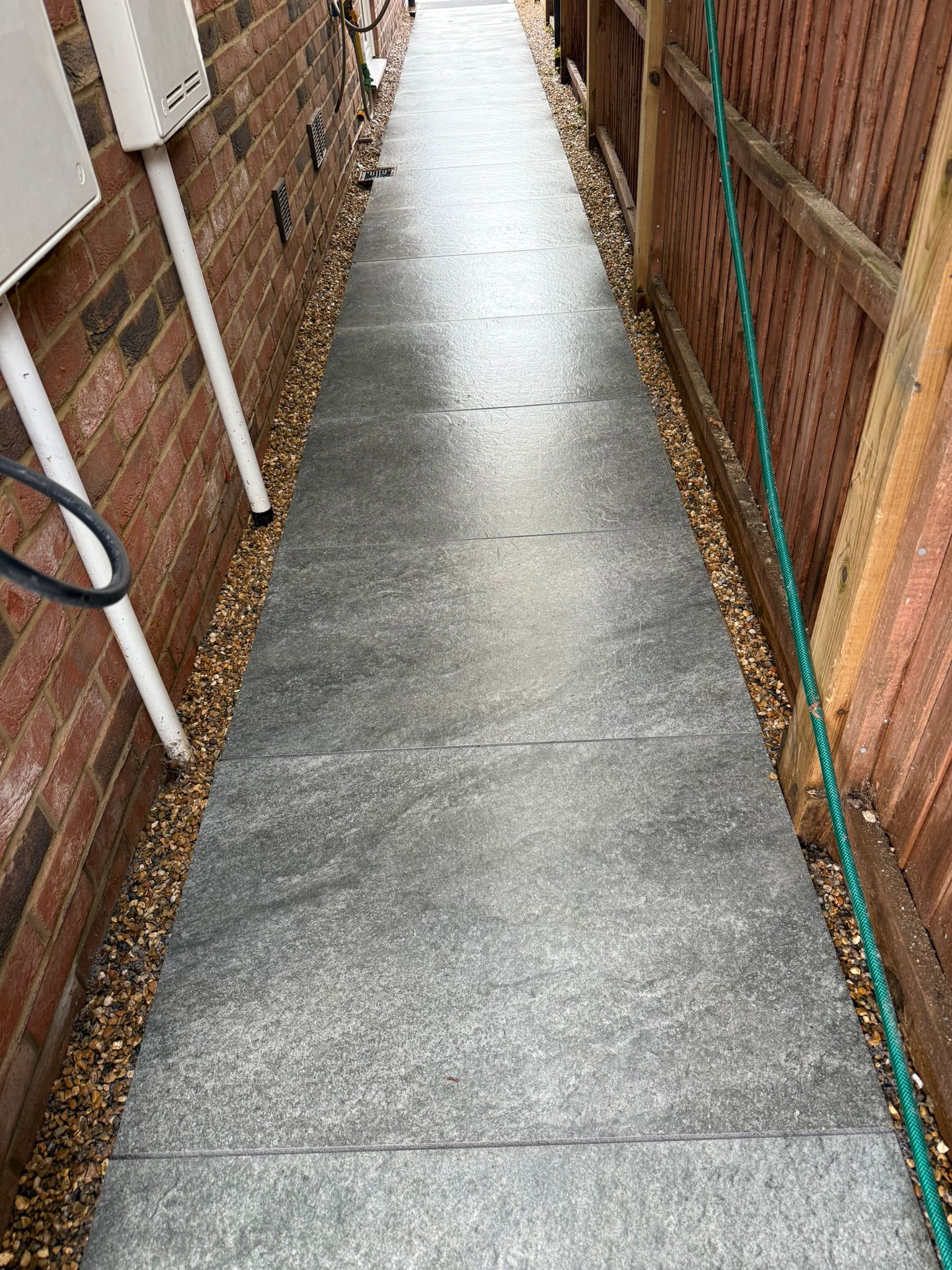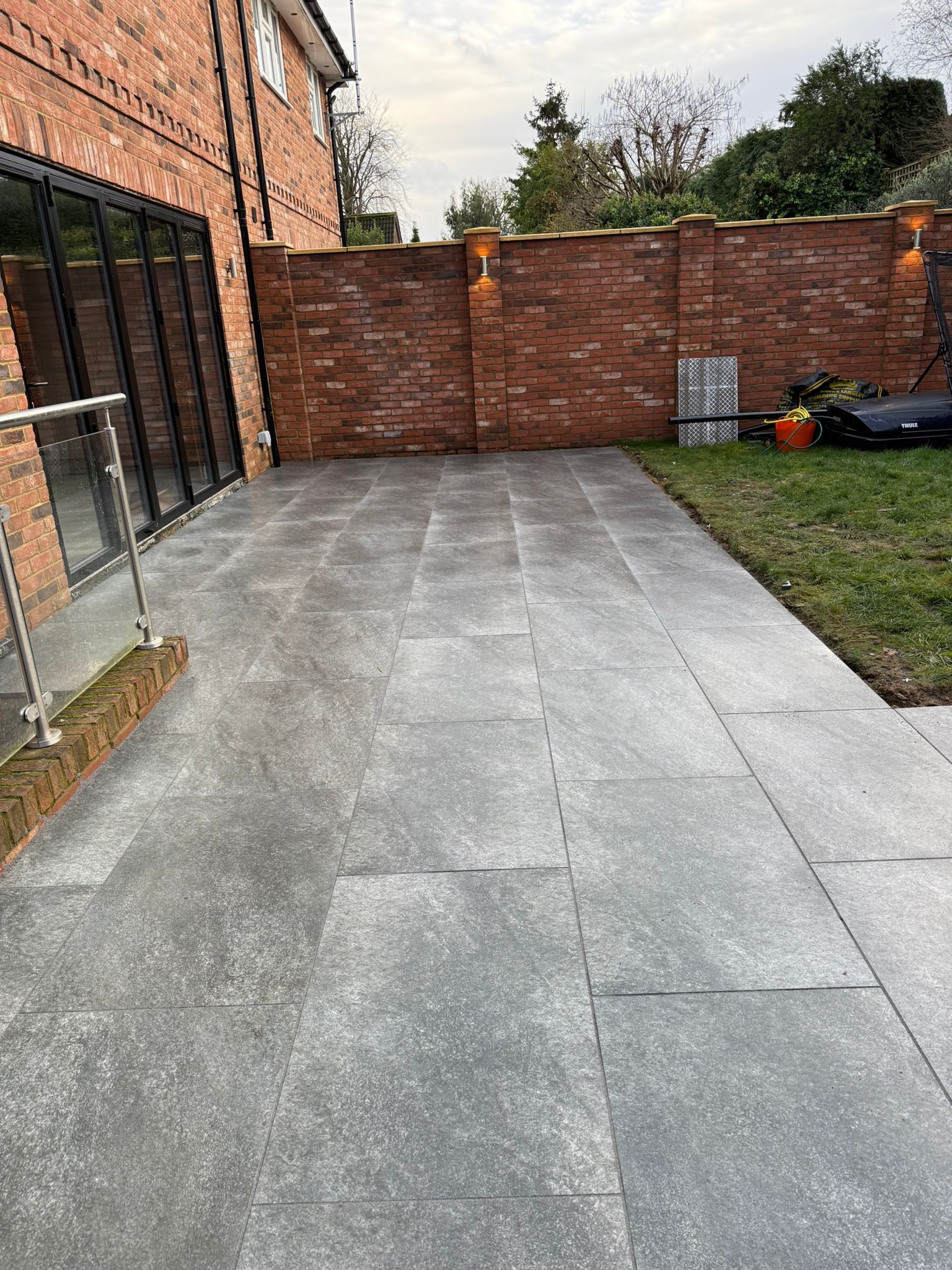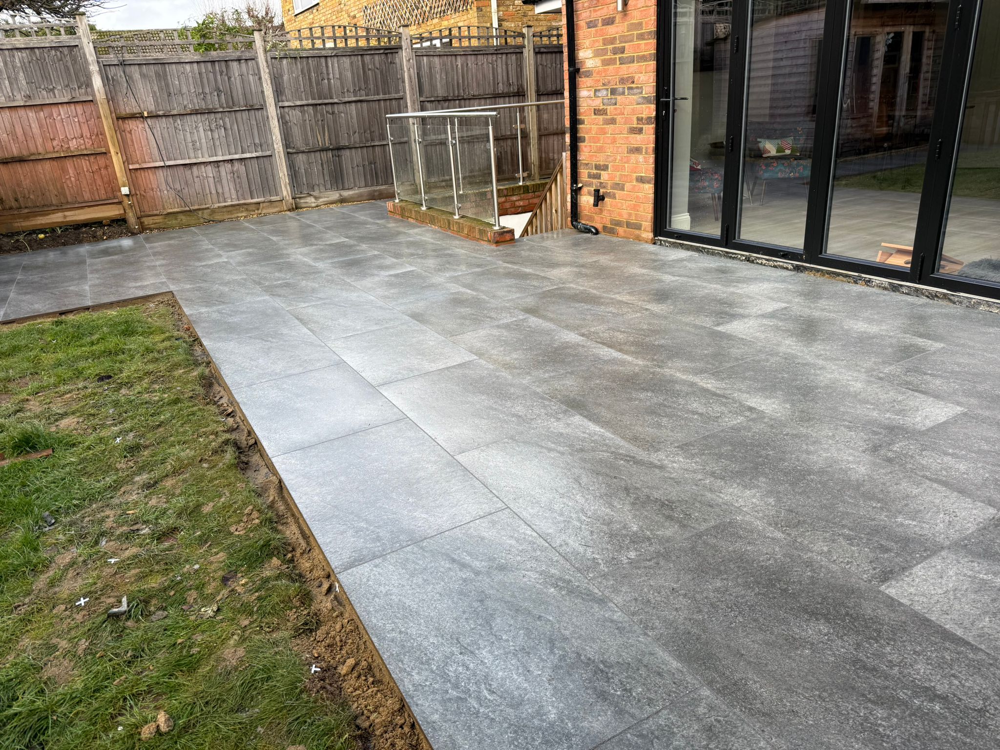 We recently transformed a garden on Longcroft Avenue in Harpenden by replacing old, tired paving slabs with a sleek new porcelain patio and path. Using Hammerstone Nero outdoor porcelain tiles, the space now has a contemporary, premium finish that’s both stylish and incredibly durable. The dark tones of the tiles create a striking contrast against the surrounding greenery, giving the garden a modern, elegant feel. Every tile was laid with precision to ensure a flawless, low-maintenance surface that will look fantastic for years to come.